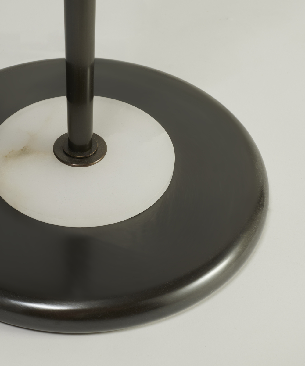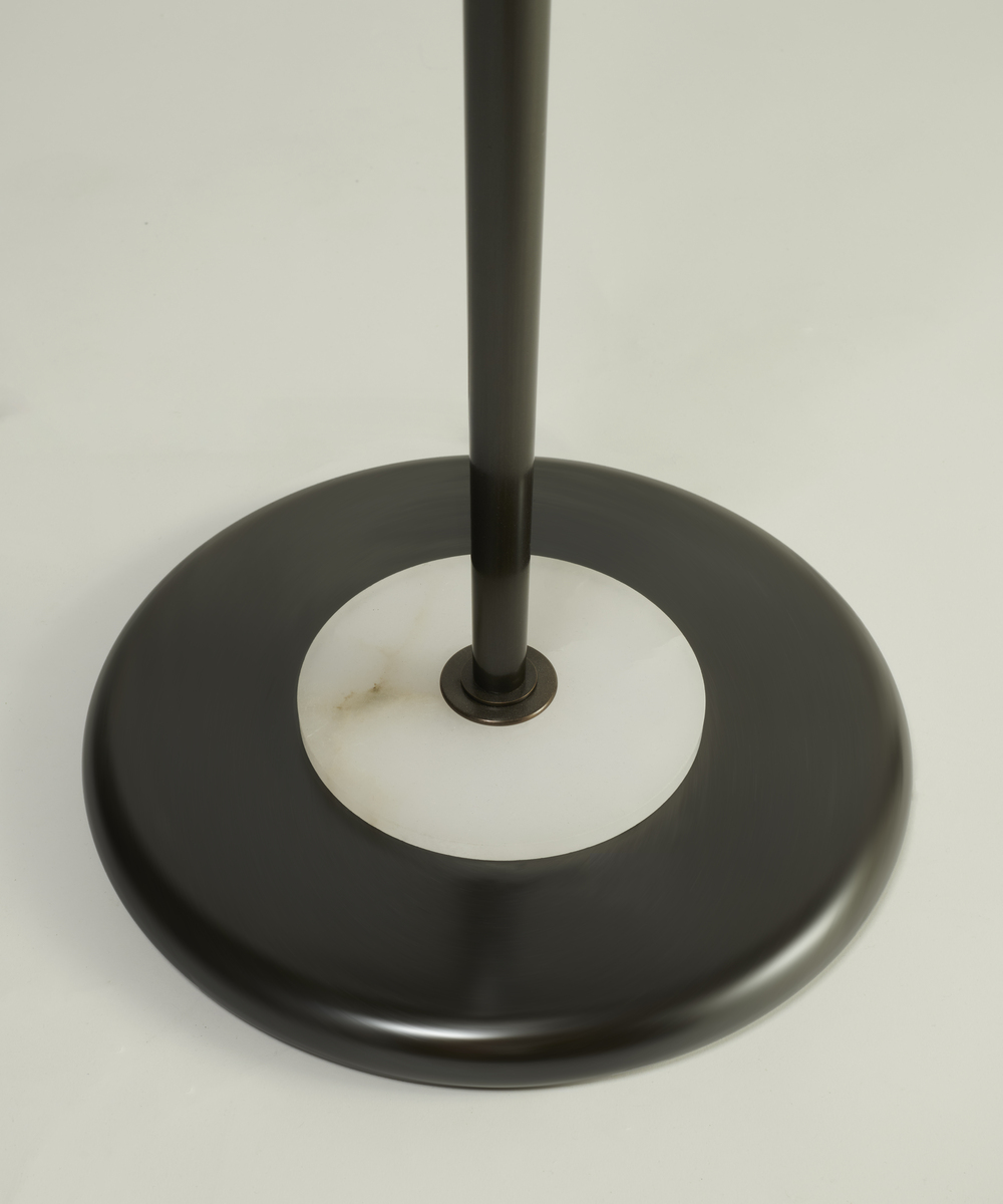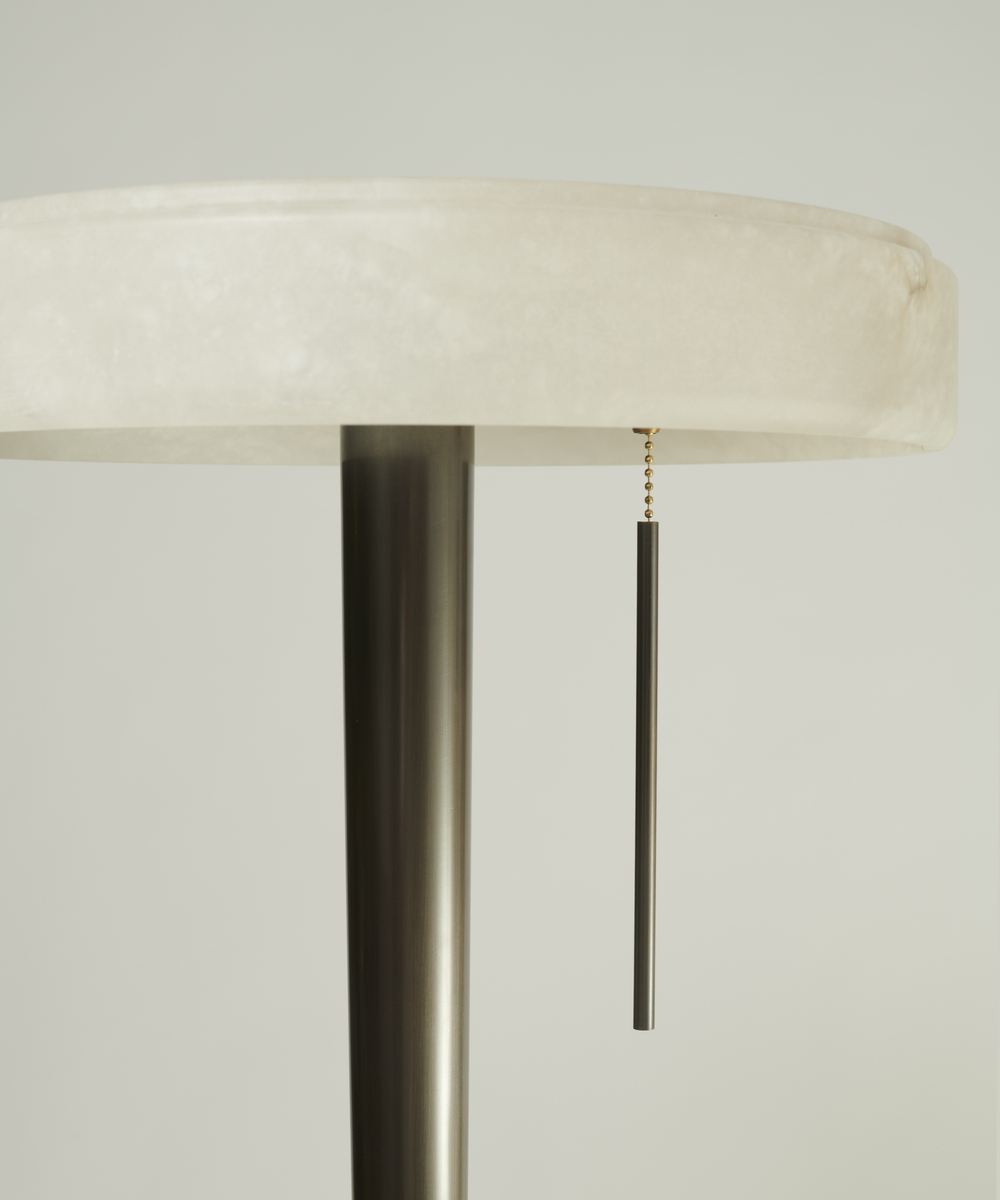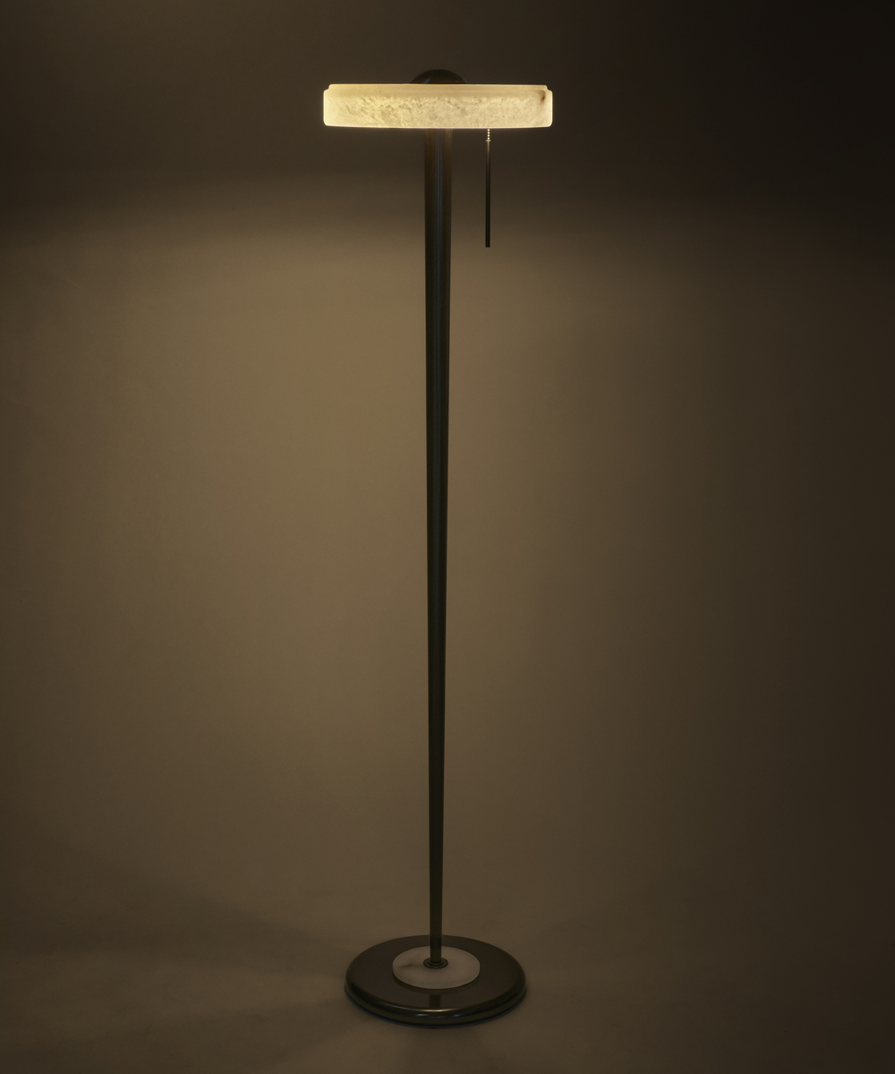 The Benny floor lamp was created following the success of its table version. It shares the same rétro spirit and refined presence. The flat alabaster lampshade diffuses a soft, warm glow, revealing the stone’s delicate veining and natural translucency. A pull-chain switch adds a vintage touch, evoking the charm of classic design. The warm tones of the light bronze structure harmonize with the alabaster, enhancing the lamp’s sophisticated elegance. A perfect fusion of precious materials and nostalgic refinement, capable of bringing character and a sense of quiet luxury to any interior.